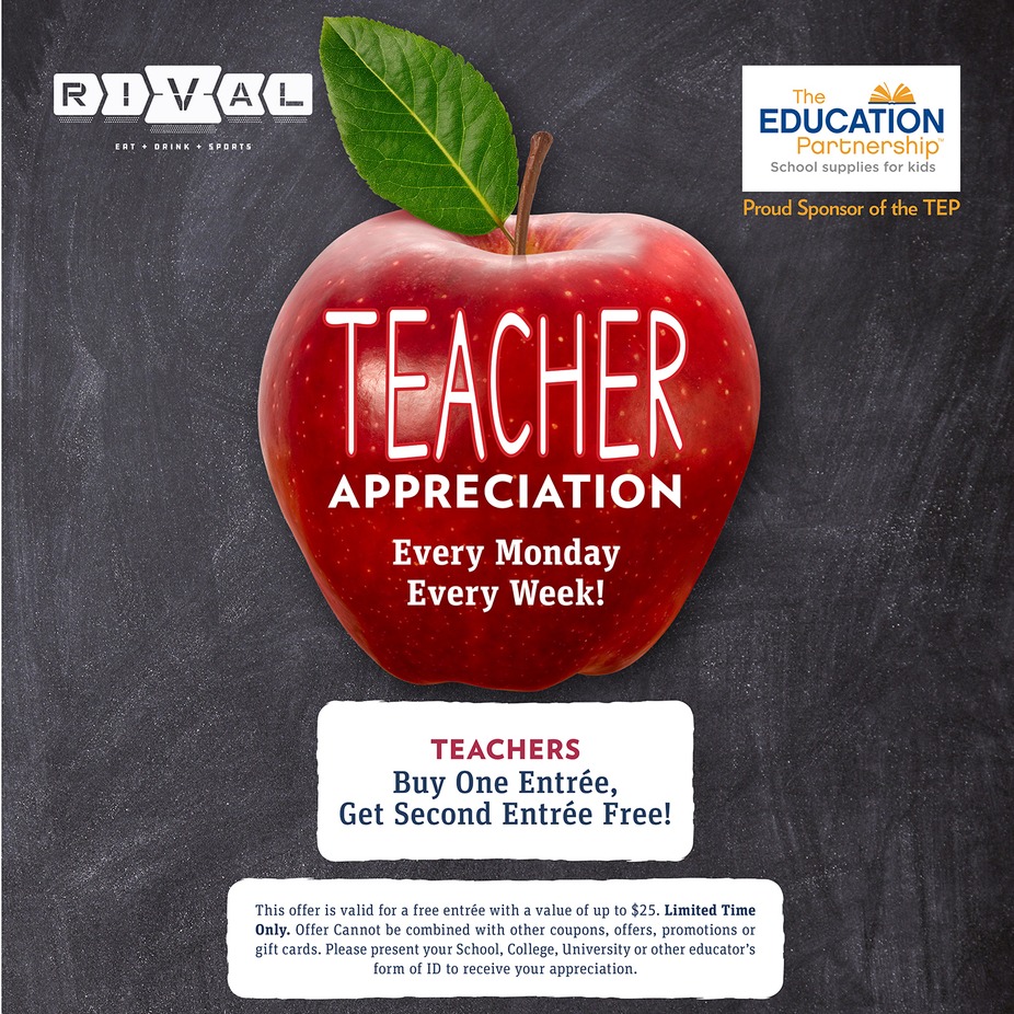 In honor of Rival's new collaboration with The Education Partnership, TEP, we're now offering the Teacher Appreciation BOGO EVERY WEEK. 🍎 🍏 🍎 🍏 A big thank you to the amazing school educators, staff, and administration. Your hard work, patience, and dedication inspire so many. The Teacher Appreciation BOGO is available for all school staff. 📚 EATRIVAL.COM